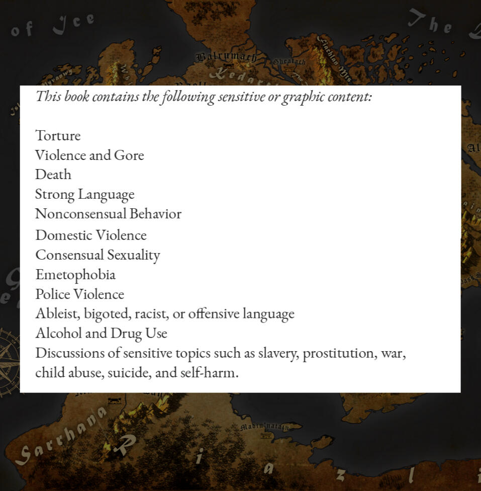This series is about characters who have been through some stuff and live in a very different world and time from ours. It deals with a lot of heavy themes including death, loss and grief, mental illness, suicide, abuse and child abuse, PTSD, and the death and loss of children. These characters also live in a very sexist, homophobic, and bigoted world.The story may trigger those with a history of abuse or suicidal ideation. Please take care of yourself and don’t read anything that will endanger your mental health. I would never wish that on anyone. If you have any specific questions or want page numbers, you are always welcome to contact me.